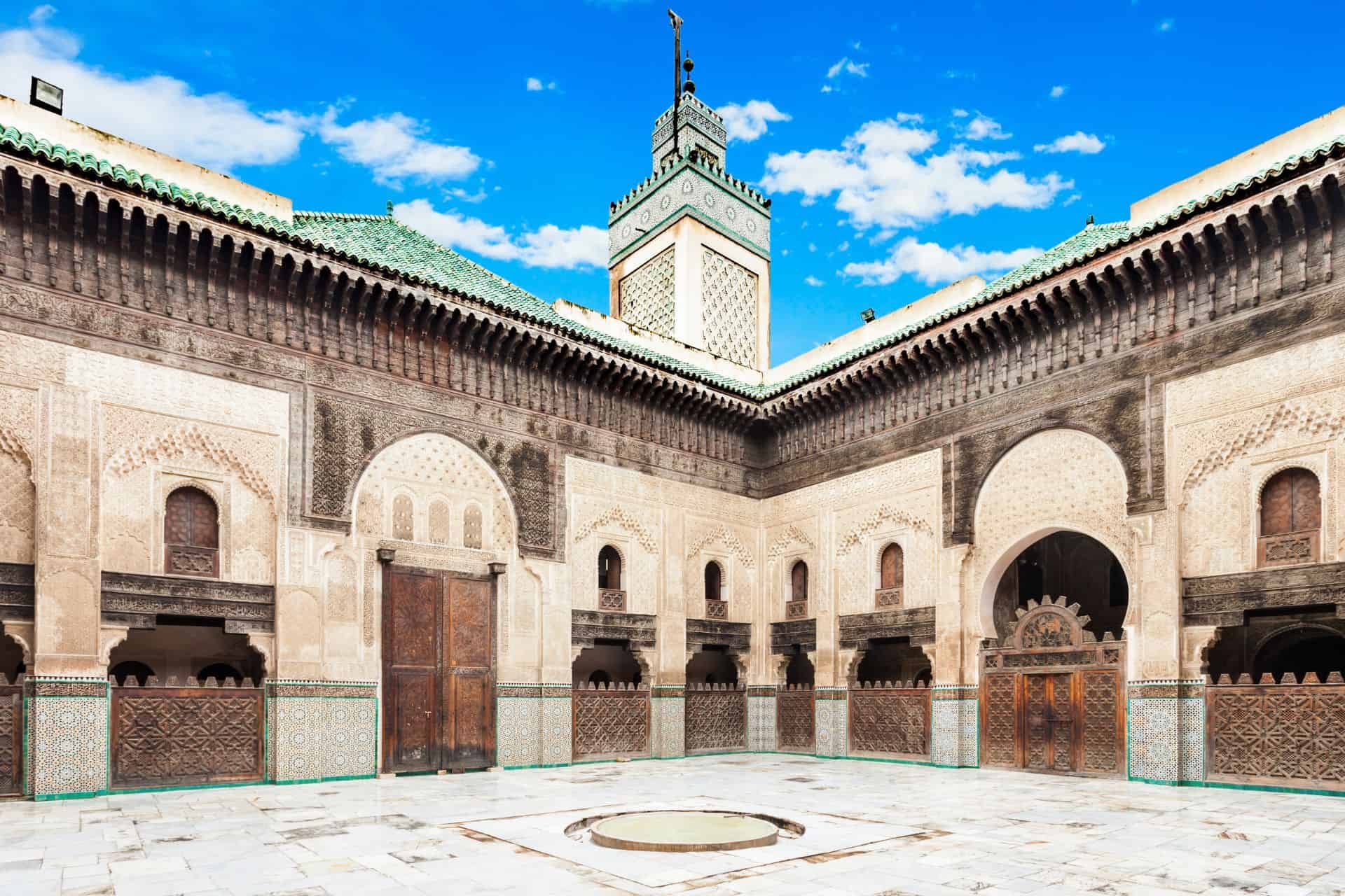 The whole day will be with local guide tour to explore Fez, the oldest town in Morocco. You ‘ll visit numerous monuments of Fez: the gate of Royal Palace, the Jewish headquarter, the Merinid tombs with the wonderful panoramic view over the whole Medina and neighbourhood of pottery. In the afternoon after lunch, a short walk in its small streets for the visit of the medina and its souks. Then the madrasa Bou Inania, the place Nejjarine and Karaouienne Mosque. Then overnight in Riad/Hotel.